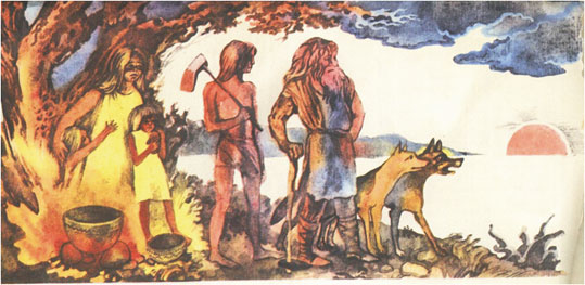 Рис. 2.1. Рисунок Н. Доброхотовой «Первобытные люди» к очерку М. Матвеевой «Путешествие через века», опубликованному в журнале «Пионер»[2]
