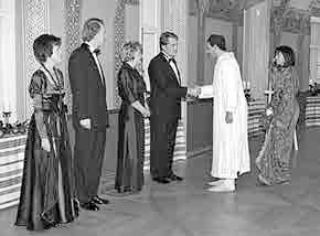 При проведении приемов подобного рода хозяин и хозяйка заблаговременно занимают место у входа в зал (предпочтительнее с левой стороны). Там они встречают гостей. Рядом с ними – в одном ряду – могут стоять 2-3 старших сотрудника с супругами, но в общей сложности число встречающих не должно превышать 6-7 человек. Один из старших дипломатов должен постоянно находиться с ними рядом и помогать принимать прибывающих важных гостей, сопровождая их, если они захотят побеседовать с кем-либо из присутствующих.