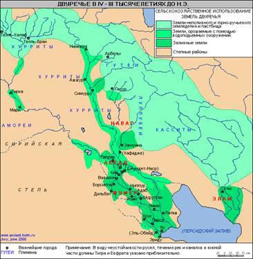 Воды рек несли ил, который содержал растительные остатки и растворенные соли горных минералов и во время половодья оставался на полях, удобряя их. Земли Месопотамии отличались исключительным плодородием. Однако для того чтобы в долине Междуречья можно было заниматься земледелием, необходим был целый комплекс мелиоративных работ, осуществлявшихся круглый год.