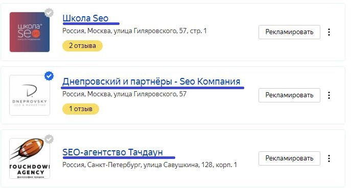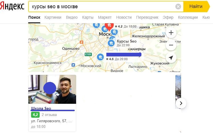 Такой метод оптимизации карточки фирмы позволит при комплексном продвижении и хорошем качестве ранжирования ресурса выходить на первые места в списке компании по адресам без особых затрат. Внедрение данного инструмента набирает свою популярность. Вот как ранжируется наш учебный центр по одному из наиболее популярных и целевых ключевых запросов на первой странице в «Яндексе»: