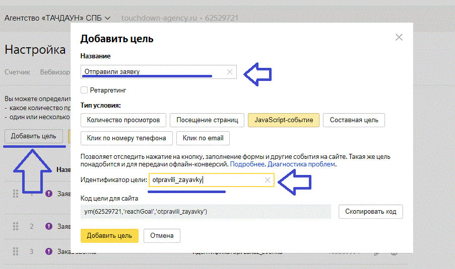 Вместо «TARGET_NAME» – идентификатор цели, указанный на картинке выше: zakazali_konsultaciyu или otpravili_zayavky.