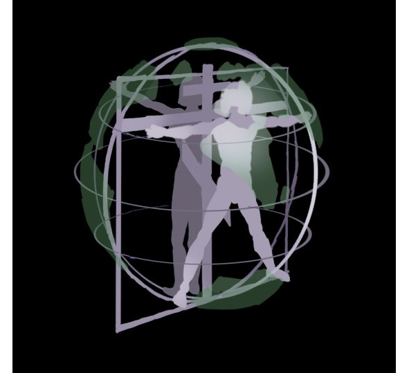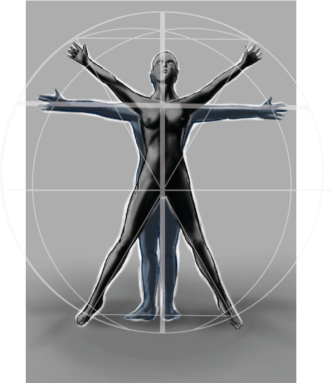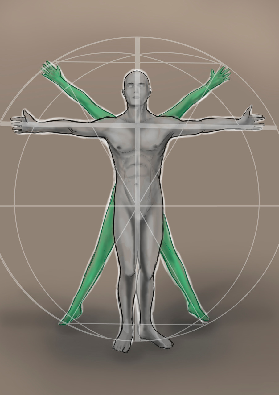 Давайте представим, что нарисованная иллюстрация «Витрувианского человека», выполнена из двух рисунков человеческих тел, заключенных в квадрат и круг в целом с наложением друг на друга. См. рис.2