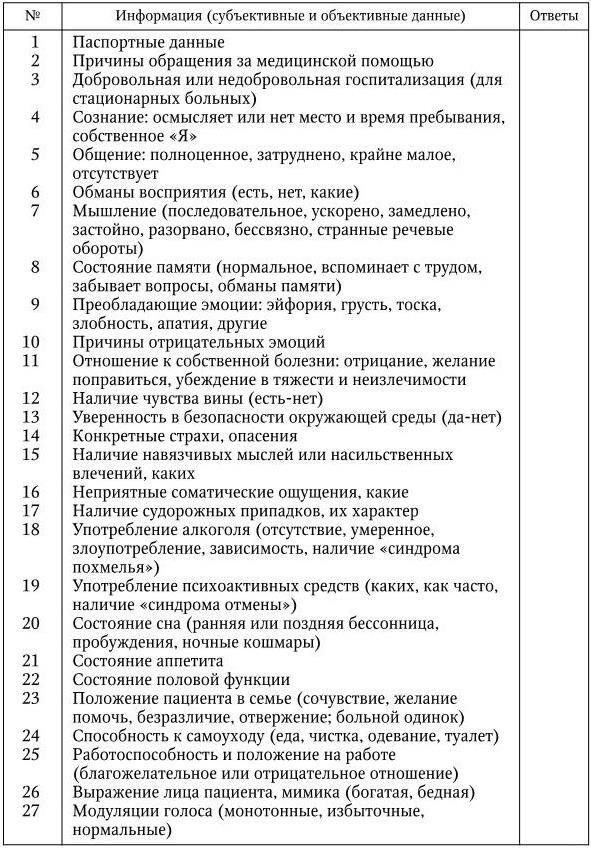 Объективные данные – это наблюдения и измерения, получаемые медсестрой во время беседы. Это и поза пациента, и его положение в постели, и выражение лица, и тембр и громкость голоса. Медсестра психиатрического учреждения должна быть физиогномистом и фиксировать по выражению лица состояние грусти, излишнего веселья, апатии, злобности и пр. Обязательно должны быть отмечены и несоответствия эмоционального переживания и выражения, такие как бодрый голос и выражение грусти на лице; или объективные сведения о тоскливости и блуждающая улыбка.