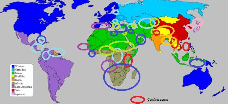 Карта 1. „Цивилизации Хантингтона” и зоны межцивилизационных конфликтов по состоянию на 2023 г.