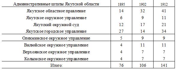 Управление Якутской областью осуществлялось на основе «Устава об управлении инородцев» 1822 года и находилось в составе Иркутского генерал-губернаторства. Вследствие этого права губернатора области, назначаемого непосредственно императором, были ограничены в финансовой области. Указ «О преобразовании областных установлений ведомства МВД Якутской области» от 17 марта 1903 г. Из ведения Общего присутствия12 областного управления изъял право решения многих хозяйственных вопросов, передав их в компетенцию Общего присутствия, состоявшего из четырёх отделений13. Рабочим аппаратом якутского губернатора и областного управления являлась канцелярия, состоявшая из отделений, руководимых советниками, и окружные исправники. Им подчинялись волости, улусы и наслеги. Улусами руководили управы, состоявшие из улусного головы, двух его заместителей и письмоводителя; наслегами – князцы, которым помогали старшины родов14. Следует отметить, что в связи с ростом населения некоторые административные роды часто насчитывали больше жителей, чем прежние наслеги, образуя новые волости. Так, у северных якутов, обитателей лесотундры по верхней Яне, Колыме и Индигирке, сформировались новые территориальные общины – тогои, сосуществовавшие наряду с устаревшим наслежно-родовым порядком.