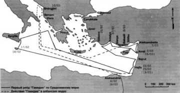 В проливе Отранто «Хамидие» попытались перехватить 4 «паровых барка», патрулировавшие сектор. Из них только «Ахелоосу» удалось сблизиться с турецким крейсером, который в скоротечном бою «повредил ему рулевой привод и заставил отступить в Дуррес. Оторвавшись от преследования, Рауф-бей увёл свой крейсер в Александрию, где с трудом добыл уголь. В конце марта он снова вышел в море и захватил греческий пароход «Испандис». Узнав о появлении у берегов Родоса греческих кораблей под командованием адмирала Миаулиса, Рауф-бей в апреле ушёл через Суэцкий канал в Джидду. «Псара» и четыре миноносца Ионической флотилии караулили рейдер у Порт-Саида до окончания войны, возложив блокаду на «паровые барки».