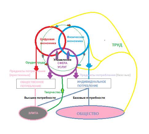 В рамках такой системы цифровая экономика способствует упрощению добычи и переработки физических ресурсов и приумножению знаний. Обслуживая и оптимизируя информационные потоки, она способствует возникновению новых продуктов и услуг, способствующих поступательному развитию общества, но не отдельных его индивидов. Третий сегмент хозяйственного уклада представляет собой сектор производства предметов потребления, как товаров, так и услуг. Его доля определяется совокупностью всех низших социальных и индивидуальных потребностей индивидов и их сообществ, связанных с жизнеобеспечением, воспроизводством труда и безопасностью. Что касается этносоциальных потребностей более высшего порядка, то они проявляется в формах культуры и контактов с другими цивилизациями, которые следует отнести к сфере потребления, а социальная потребность в саморазвитии способствует научному прогрессу и является частью нематериального производства.