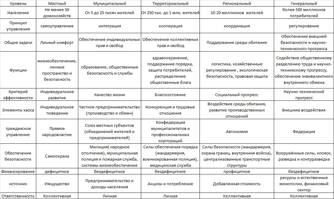 Основным инструментом, реализующим ПОС, представляется механизм общественного контроля1344, обеспечивающий доступ к любой внутрисистемной информации. Таблица ХIV даёт представление о распределении целей, функций и ответственности неофизиократии, построенной на принципах CRT1345. Она пригодна при формировании регулятора в моделях „виртуального национализма” и квазиавтаркии и должна содержать несколько уровней управления. Каждый из них должен поддерживать справедливую конкуренцию между субъектами системы различного уровня и обеспечивать их безопасность от вмешательства извне или со стороны маргинальных элементов1346. Важную роль в контроле за проявлениями непотизма в органах власти может сыграть такая функция, кае выявление родственных и дружеских связей РЕР.