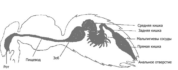 С их помощью пчела придает форму частицам воска, грызет дерево, ест пыльцу, кормит личинок, захватает враждебных насекомых, выносит их и мусор из улья- своего домика. Нижняя губа вместе с нижними челюстями образуют вытянутый хоботок, которым пчела засасывает сладкий, прозрачный цветочный сок – нектар. Пищеварительная система пчелы начинается на нижней стороне головы ртом, который продолжается глоткой, пищеводом, медовым зобиком, желудком и заканчивается кишкой, расположенной в ее брюшке. Рис.№7