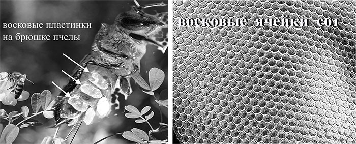 Вторым по значимости, по употреблению следует назвать пчелиный воск, образующийся в особых железах, расположенных на брюшной стороне тела пчелы в виде мельчайших восковых чешуек. Пчёлы, используя конечности, из этих чешуек строят соты. С точки зрения химии, воск сложное вещество, чрезвычайно богатое различными полезными веществами [49]. В его состав входят линейные, восковые моноэфиры (35–45 %), сложные эфиры воска (15–27 %), предельные углеводороды парафинового ряда (12–16 %), свободные жирные кислоты (миноцериновая, церотиновая и др.-12–14 %), спирты (около 1 %), ароматические вещества, вода, растительные пигменты, минеральные и иные вещества. Главные компоненты воска это полимерные жирные органические кислоты и спирты, сложные эфиры кислот и спиртов, основным из них является мерициловый эфир пальмитиновой кислоты. Цвет воска зависит от красящих веществ, переходящих в него из прополиса и пыльцы. Пчёлы вырабатывают чисто-белый воск. Потом, при взаимодействии с другими продуктами их жизнедеятельности, воск окрашивается в желтоватый цвет. Чем старше соты и чем больше поколений пчёл в них выросло, тем в их структуре остаётся всё меньше воска и становится темнее окраска. В самых старых его образцах, почти угольного цвета, воска меньше половины [81].