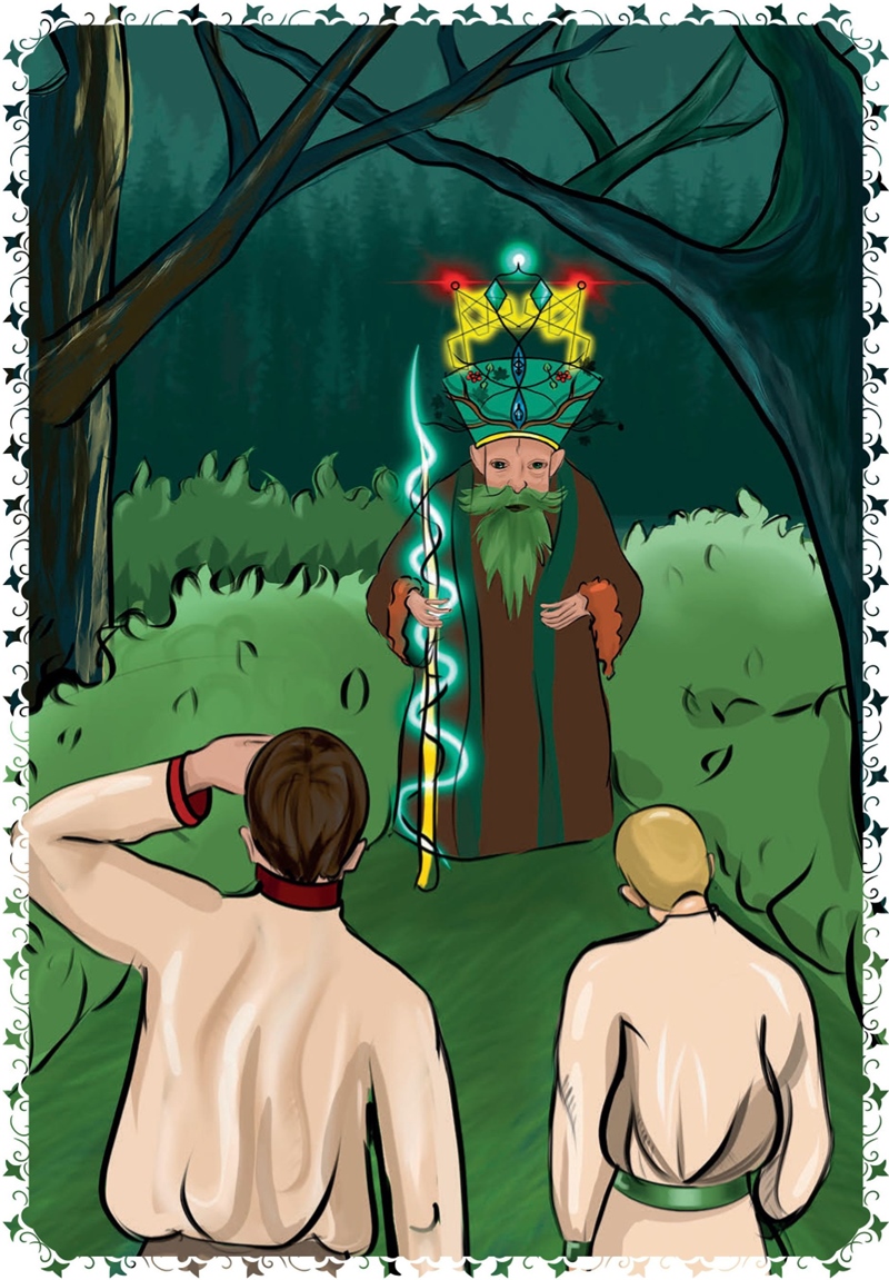 Только сказал, вдруг откуда ни возьмись маленький старичок, сам весь сморщенный, а борода зелёная по колено.