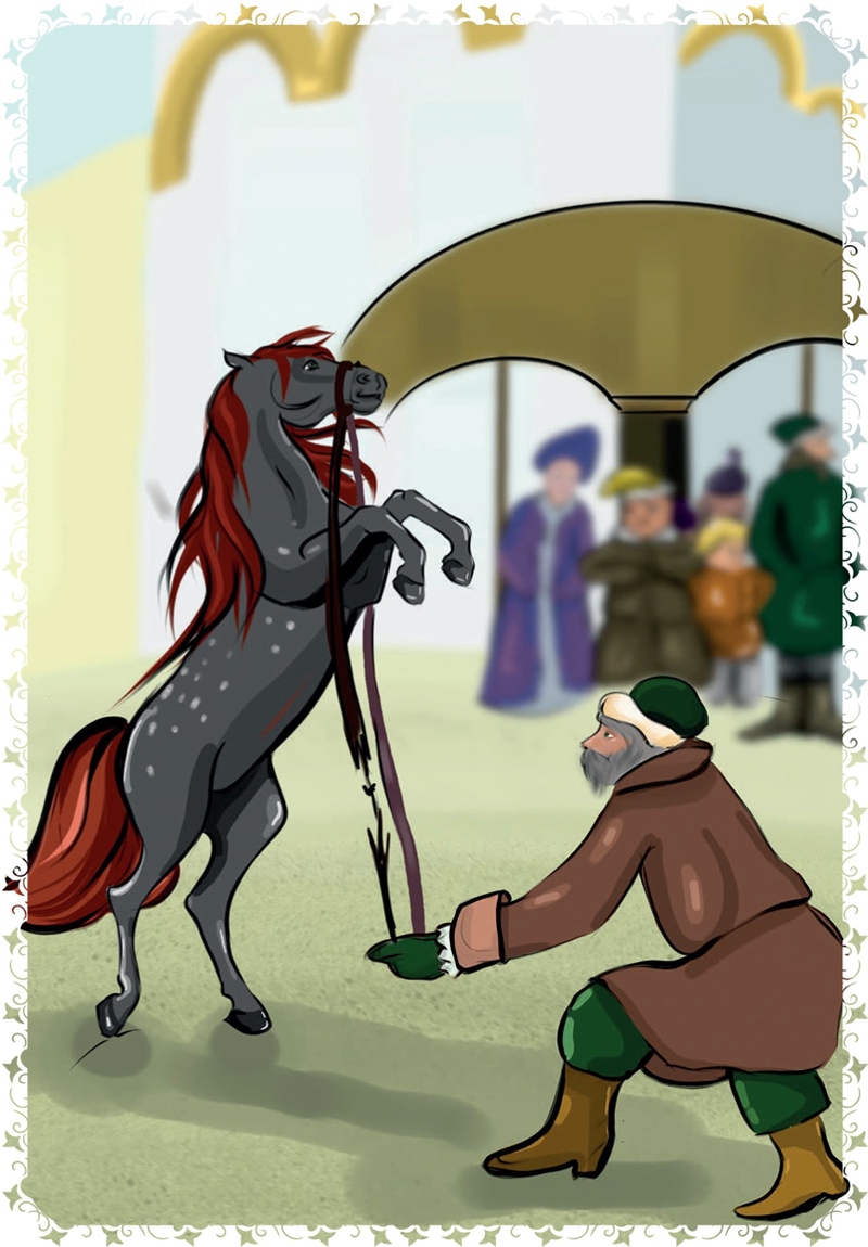 Вот приходят они на ярмарку. Сын обернулся конём. Такой конь лихой – и приступить страшно! Старик тянет его за уздечку, а он удила рвёт, копытами землю бьёт. Понаходило тут купцов видимо-невидимо – торгуют у старика коня.