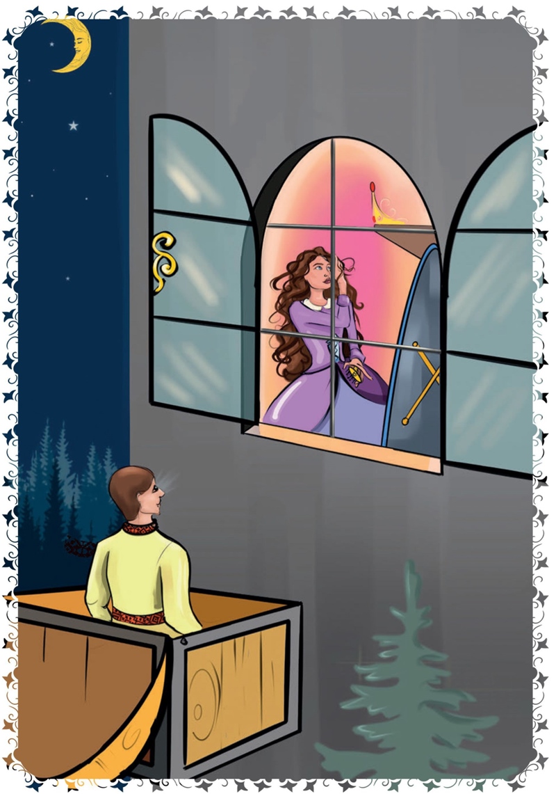 А когда ткач полетел, то летел он целую неделю и спустился на скирду сена. Когда наступил вечер, видит он, что в городе за две мили светится, покрутил ещё ручку и полетел прямо на огоньки. Подлетает к свету, к окну, а был это дворец, где жил король; и была у того короля такая красавица дочка, что королю приходилось её на ночь на третий ярус уводить, он всё за неё боялся, чтоб она какой беды не наделала.