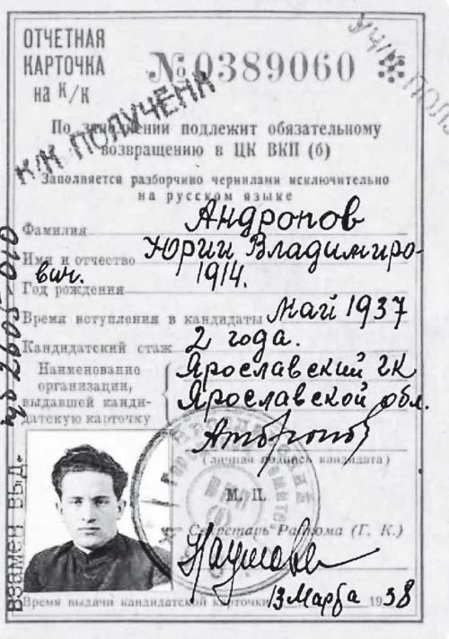 Отчётная карточка кандидата в члены ВКП (б) Ю. Андропова.