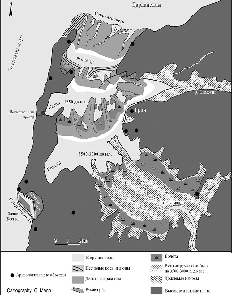 Стоит подчеркнуть, что Скамандр в своем нижнем течении протекал и протекает по плоской равнине, разветвляясь на несколько рукавов, которые постоянно меняют свой путь. В отложениях, оставленных этой рекой, палеогеографы обнаружили следы десятков русел39, и вопрос, какое из них и есть Скамандр, не имеет особого смысла.