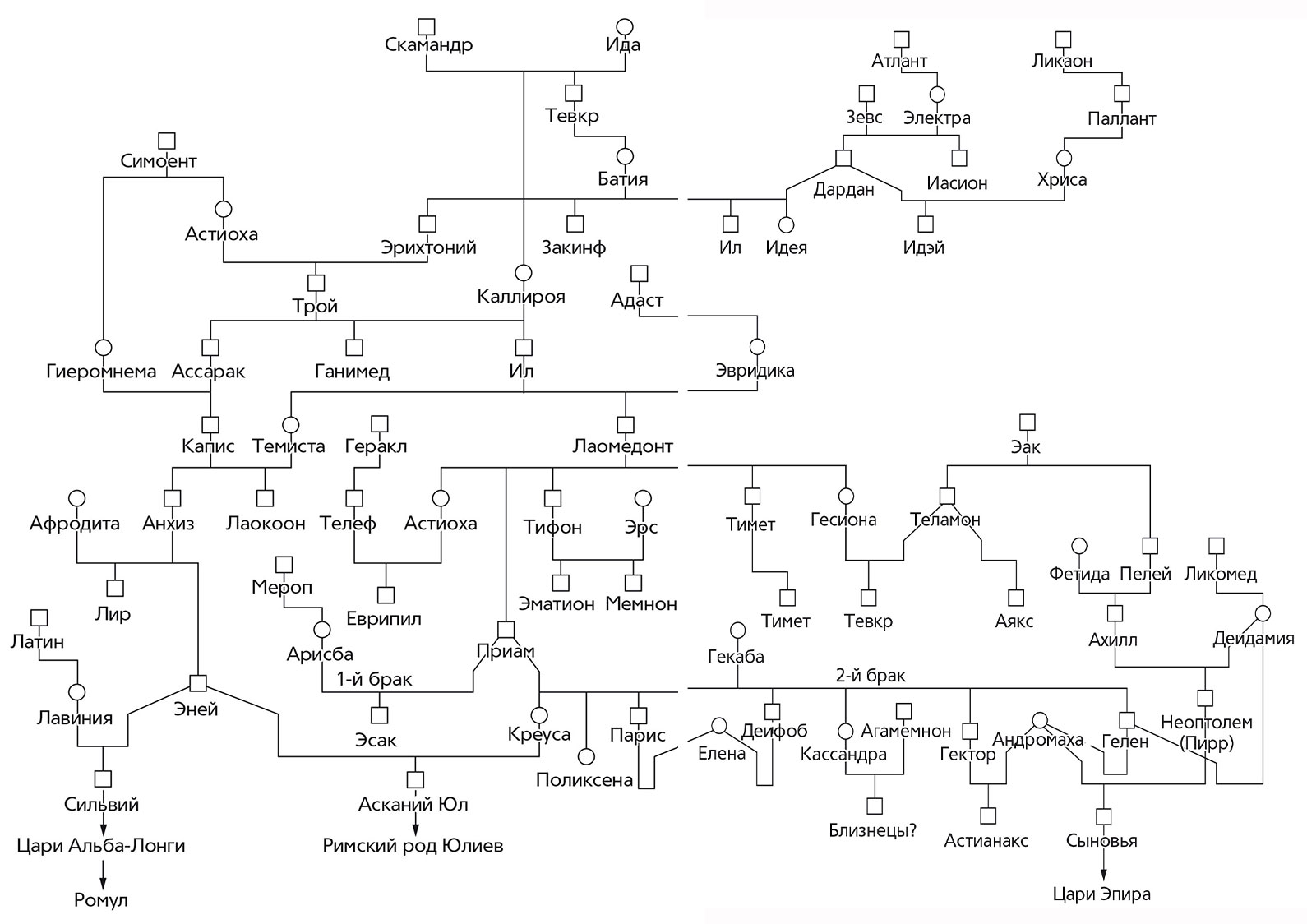 Ассарак сам по себе ничего выдающегося не совершил. Но он женился на одной из дочерей Симоента; их сын вступил в брак со своей двоюродной сестрой, дочерью Ила. Плодом их брака стал знаменитый Анхиз – любовник Афродиты, заставивший саму богиню любви терзаться от всепоглощающей страсти89. А сын Анхиза и Афродиты, Эней, после падения Трои вывез уцелевших троянцев в Италию, к устью Тибра, где его потомки стали основателями Рима. К Энею (и, соответственно, к Ассараку) возводили свой род многие знаменитые римляне, в частности Юлий Цезарь. Поэтому Ассараку стоило посвятить абзац, хотя о нем самом сказать практически нечего.