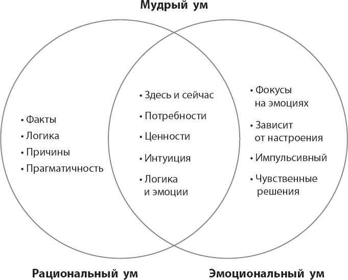 В этом режиме мы слушаем и свой разум, и свое сердце, понимаем ценность как логики, так и эмоций. Мудрый ум позволяет нам соединиться со своими чувствами, не теряя при этом контроля над ними. Мы прислушиваемся к фактам, не игнорируя своих убеждений. Мудрый ум объединяет, интегрирует все доступные нам способы познания: наблюдение, логический анализ, физические ощущения, познание в деятельности, интуицию. Например, при покупке дома мы рассматриваем как важные для принятия решения факты, так и эмоции, связанные с этим решением.