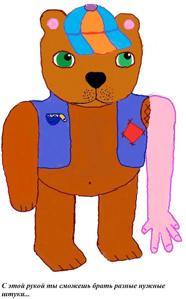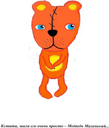 Также, в книге нам встретится еще один главный герой будущих приключений. Как ни странно, тоже медведь. Был раза в два ниже ростом, чем Мишка Пульт, и был плотно набит маленькими кусочками поролона. Тут стоит сделать небольшое отступление, чтобы рассказать читателю о небольшой, но не очень приятной проблеме, которая постоянно преследовала второго медведя. Кстати, звали его очень просто – Медведь Маленький. На фамилию он особо не претендовал, впрочем, как и на имя, поэтому вышло как-то так. Но вернемся, скорее, к проблеме.