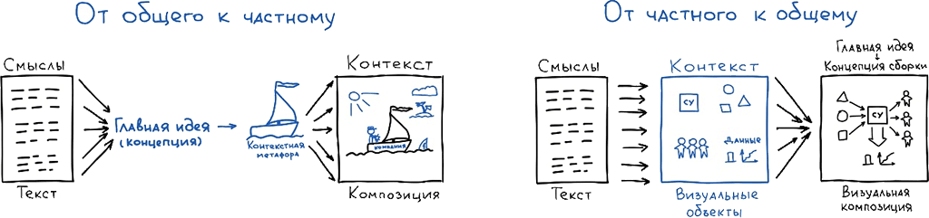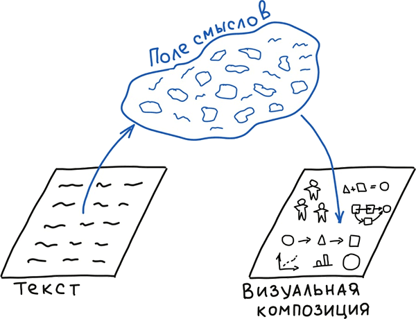 «Подняв» поле смыслов над текстом, мы работаем с этим полем и превращаем смысловые объекты в визуальные образы. Из образов собирается структура – визуальная композиция.