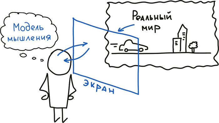 О мышлении много написано и сказано, но так и нет однозначного ответа, что же такое мышление. Мне близка следующая теория. Мы воспринимаем мир не напрямую, а через построение моделей восприятия. Например, информация о реальном мире поступает в мозг через наши органы чувств. И мозг на базе этой информации строит модель реального мира. Модель мышления можно представить в виде некоторой призмы (экрана), через которую мы воспринимаем реальность.