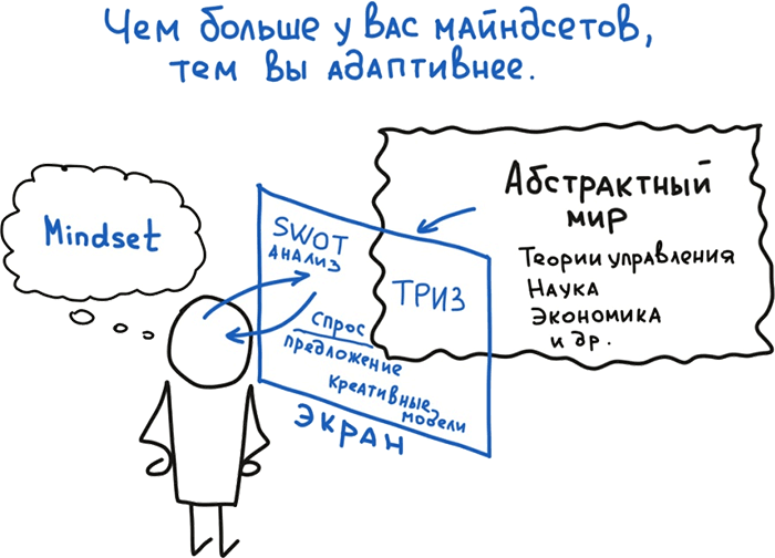Для описания моделей мышления можно использовать слово из английского языка – mindset. Сегодня часто используется это понятие, когда говорят, что человека нужно чему-то обучить. Как бы загрузить новый mindset в голову, т. е. предустановить новую модель мышления. И получается, чем больше моделей мышления мы себе установили и можем использовать, тем мы круче в быстро меняющемся мире.