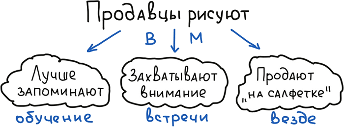Натренировавшись работать по шаблонам, продавцы стали импровизировать и могли буквально «на салфетке» рассказать про свой продукт. Рисующие продавцы и просто производили вау-эффект на клиентов, их запоминали. Вот вам и ещё одна сфера применения визуального мышления – визуальная аргументация в продажах.