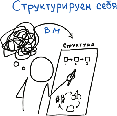 Но в каких бы мыслеформах не проявлялись наши мысли в сознательной части, всегда есть проблема – удержать их в голове, выстроить логику, связать в какую-нибудь структуру. Чтобы это сделать, нужно каким-то образом зафиксировать их вне головы. Здесь и появляется третья часть модели – Структура. Работа со Структурой также запускает некоторые процессы в бессознательном. И получается замкнутый процесс мышления между тремя частями: Кишмиш – Мысли – Структура.