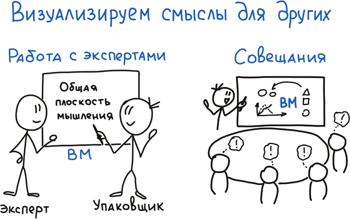 Используя смысловую визуальную плоскость, можно синхронизировать группу людей. Например, через визуальную фасилитацию помогать эффективнее проводить совещания, мозговые штурмы и другие групповые активности. Прокаченное визуальное мышление можно использовать при работе с экспертами. Например, когда из эксперта нужно «вытащить» и передать какие-то знания.