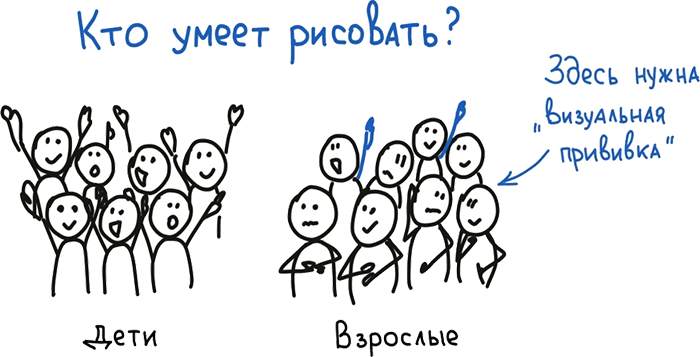 Когда начинаешь говорить про визуализацию и рисование, большинство людей отвечают: «Это не для меня. Я не умею рисовать». Если во взрослой аудитории задать вопрос: «Кто умеет рисовать?», поднимется две-три руки. Моя практика показала, что не более 10 % обычно поднимают руки. Если в детской аудитории задать аналогичный вопрос, то поднимется лес рук. Не знаю, где на пути взросления люди теряют этот навык или просто думают, что теряют. Но однозначно могу сказать, если взрослому человеку сделать «прививку визуализации», дать попробовать, то навык быстро восстанавливается.