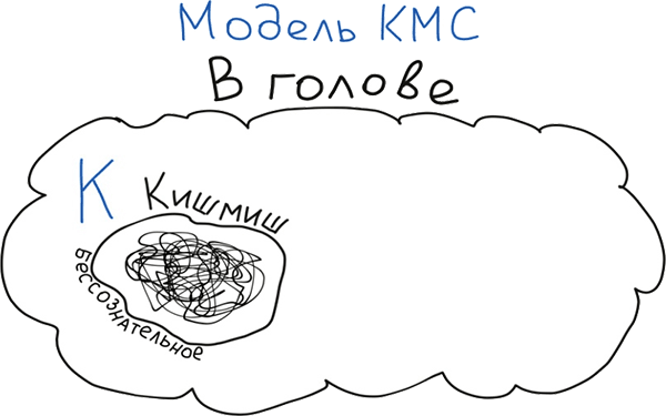 То, что происходит у нас в голове, можно разделить на два основных процесса: бессознательное и сознательное. Что происходит в бессознательном – не всегда понятно, но оно, безусловно, работает. Там блуждают обрывки знаний, образов и много чего ещё. Назовём в нашей модели эту часть мышления – Кишмиш.