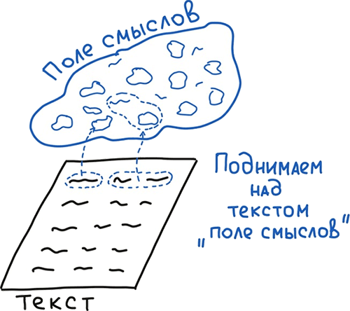 Процесс тренировки состоит в следующем. Чтобы визуализировать смысл текста, нам приходиться работать как бы не с самим текстом, а с полем смыслов этого текста. Ведь за одними и теми же словами у разных людей стоят разные понятия, контекст и смыслы. На своих тренингах по визуальному мышлению я много раз видел, как одни и те же тексты участники визуализировали по-разному.