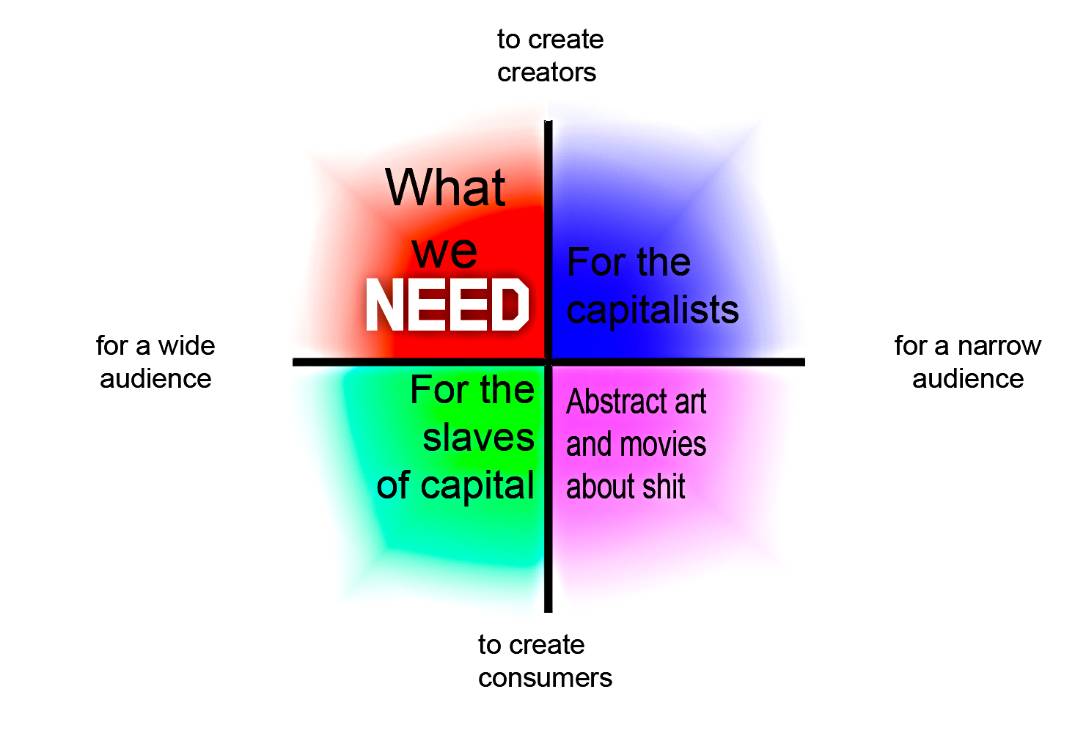 Therefore, in the world of capitalists, art is divided into art for the education of sellers of labor, moreover cheap and skilled, and art for the education of the creators of capitalism. Our task is also to educate creators from people. Only of all people.
