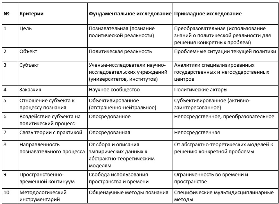 Таблица 1. Критерии разграничения фундаментальной и прикладной политологии