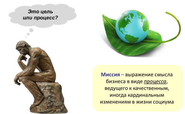 О миссии сказано и написано очень много. Однако до сих пор многие руководители, отдавая дань управленческой моде, считают миссию жизненной необходимостью и стремятся ее сформулировать. В итоге, чаще всего, мы видим т.н. псевдомиссии как общие и расплывчатые фразы о намерениях или ценностном предложении компании. Миссия должна выходить за пределы бизнеса. Это не цель. Это путь, процесс. Она должна показывать вклад организации в развитие отрасли, города, региона, страны, общества. Часто это сделать очень непросто. Но к счастью, это делать совсем необязательно. Тем не менее, хорошая миссия привлекает внимание клиентов, поставщиков, инвесторов, заряжает персонал, создает неповторимый образ компании… и помогает формулировать качественные цели, не сводящиеся лишь к получению прибыли, росту продаж или сокращению операционных расходов.