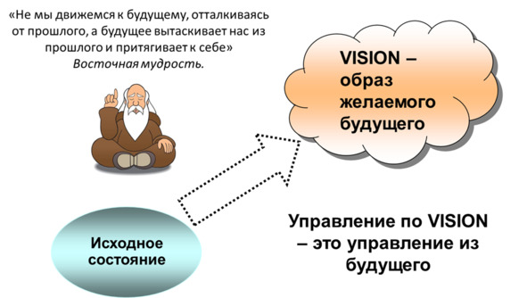 Третий источник проактивных целей – стратегическое видение или образ желаемого будущего (VISION) компании. Когда организация имеет VISION, включается метафизический механизм самоисполняющихся пророчеств или эффект Пигмалиона, ибо, как гласит известная восточная мудрость, «не мы движемся к будущему, отталкиваясь от прошлого, а будущее вытаскивает нас из прошлого и притягивает к себе». А если этот образ существует не только в голове у собственника, но и разрабатывается «всем миром» или хотя бы тиражируется по всей организации, то эффект Пигмалиона дополняется эффектом синергии, когда все сотрудники начинают подсознательно действовать, думать, стоять, сидеть, лежать в направлении одной общей цели.