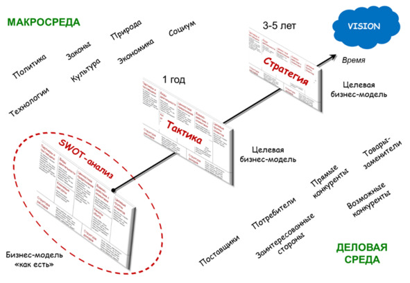 На данном этапе, исходя из VISION, «прокачиваем» бизнес-модель и разрабатываем стратегию компании. Для построения бизнес-модели можно использовать, например, известный шаблон А. Остервальдера. При этом важно построить не только актуальную текущую бизнес-модель («как есть»), но и целевую бизнес-модель («как надо»), включающую стратегические и/или тактические изменения в ближайшие 1-3-5 лет.