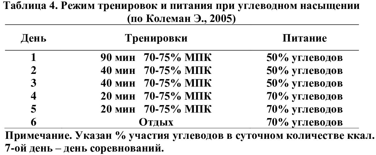 В таблице 4 представлен шестидневный режим тренировок и питания, используемый для углеводного насыщения. В первый день, за шесть дней до соревнований, проводят интенсивную тренировку продолжительностью 90 минут на уровне 70 % от максимального потребления кислорода (МПК). В следующие два дня продолжительность занятий снижают до 40 минут. За три дня до соревнований продолжительность занятий до 20 минут. За день до соревнований – отдых.