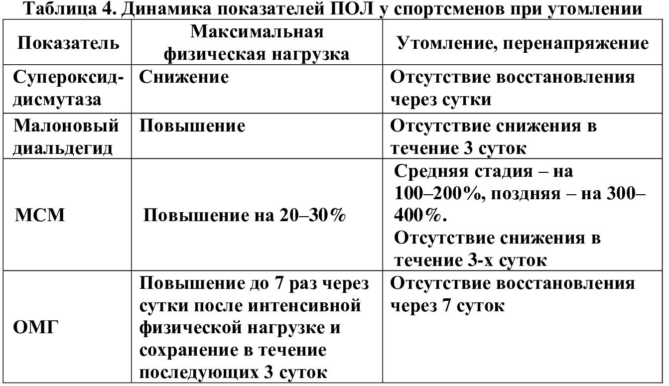 Показатели перекисного окисления при утомлении (оценка гипоксии и реперфузии тканей)Повышение:
