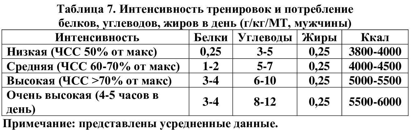 Средняя интенсивность нагрузки и близким к ней значениям. Углеводы в диете для мужчины должны составлять 5–7 г/кг МТ, для женщины ‒ 3–5 г/кг МТ.