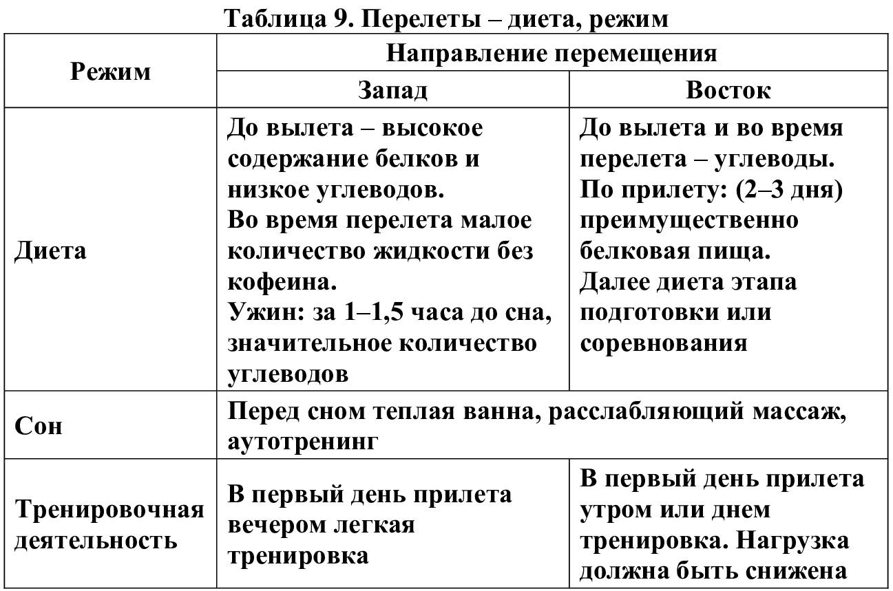Так как внутренние биологические часы имеют тенденцию работать больше 24 часов (25–27), этим они облегчают адаптацию к удлиненным суткам при перемещении в западном направлении. Здесь более легкая адаптация внутренних часов к фазовой задержке (то есть смещение эндогенных ритмов на более позднее время). Десинхроноз – рассогласование внутренних ритмов организма с временем места прилета – существенная проблема, снижающая работоспособность спортсмена.