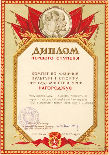 Диплом Ярослава Керода – победителя чемпионата Украины по самбо. 1955