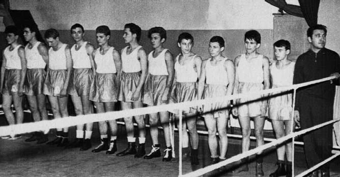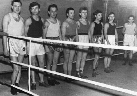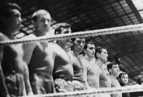 Матчевая встреча боксёров «Трудовых резервов» Ленинграда и Москвы в 1962 году. Олег Кузьмин – шестой слева; крайний справа – старший тренер О. Ф. Богомолов.