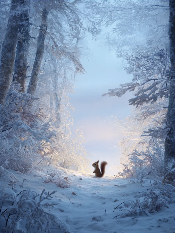 Всё было в снегу. Белое, глубокое, пушистое. Ни одного орешка. Ни одной шишки. Ни одного знакомого следа.