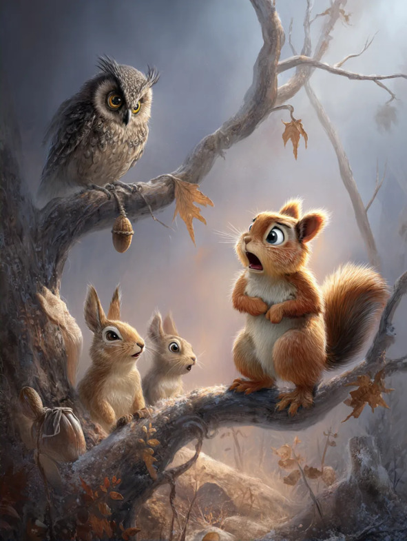 – Кто украл мои орешки? – возмущённо крикнул он, прыгая по ветвям.
