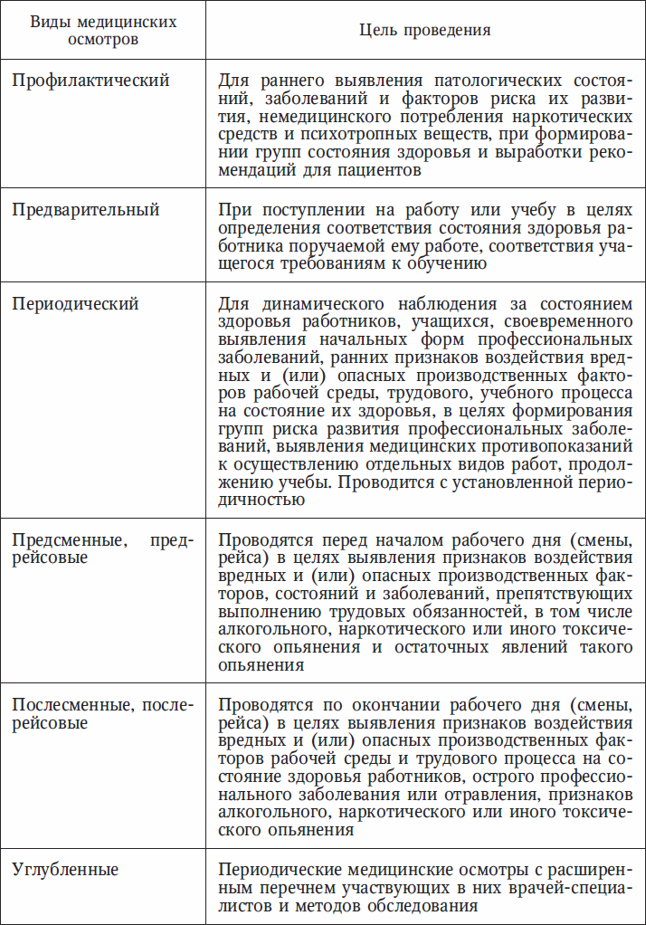 Медицинский осмотр представляет собой комплекс медицинских вмешательств, направленных на выявление патологических состояний, заболеваний и факторов риска их развития. Федеральным законом «Об основах охраны здоровья граждан в Российской Федерации» определены следующие виды медицинских осмотров (табл. 2).