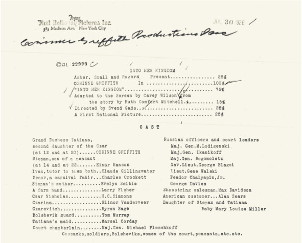 Цитата из документа заявителя (Corinne Griffith Productions, Inc.) о регистрации прав на завершённый в производстве фильм «В её королевство» (1926) 22
