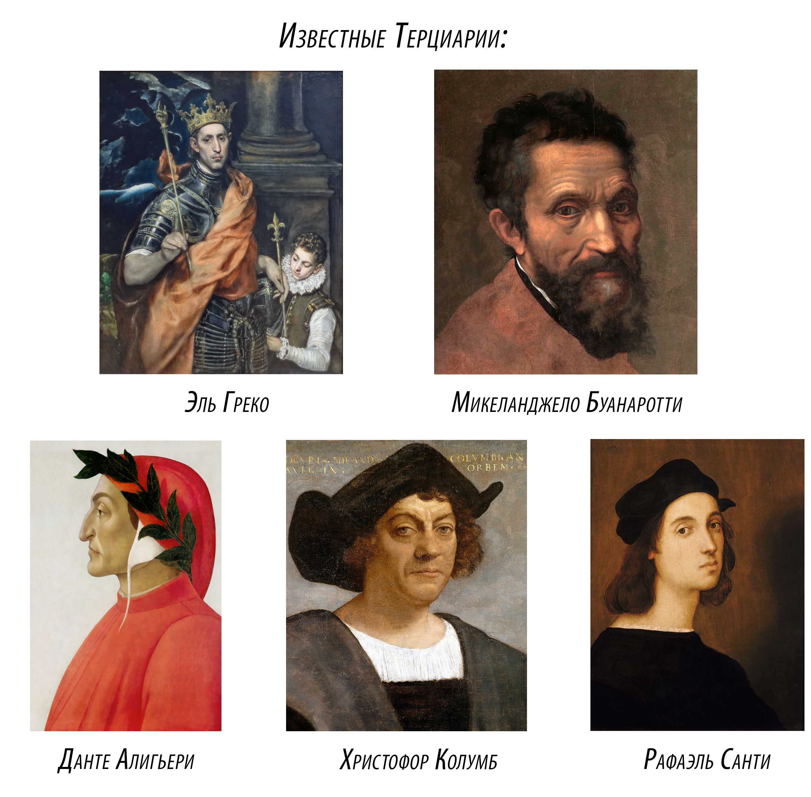 Пятой линией францисканцев является «Третий орден Св. Франциска» (терциарии) – учреждён Св. Франциском около 1221 г. Получил в 1401 году собственный устав и название Третьего ордена устава Св. Франциска. Помимо терциариев, которые жили в монастыре, существовало значительное число терциариев, живущих в миру. И среди них было много выдающихся людей: Данте Алигьери, король Людовик IX Святой, Микеланджело Буонарроти, Рафаэль Санти, Христофор Колумб.