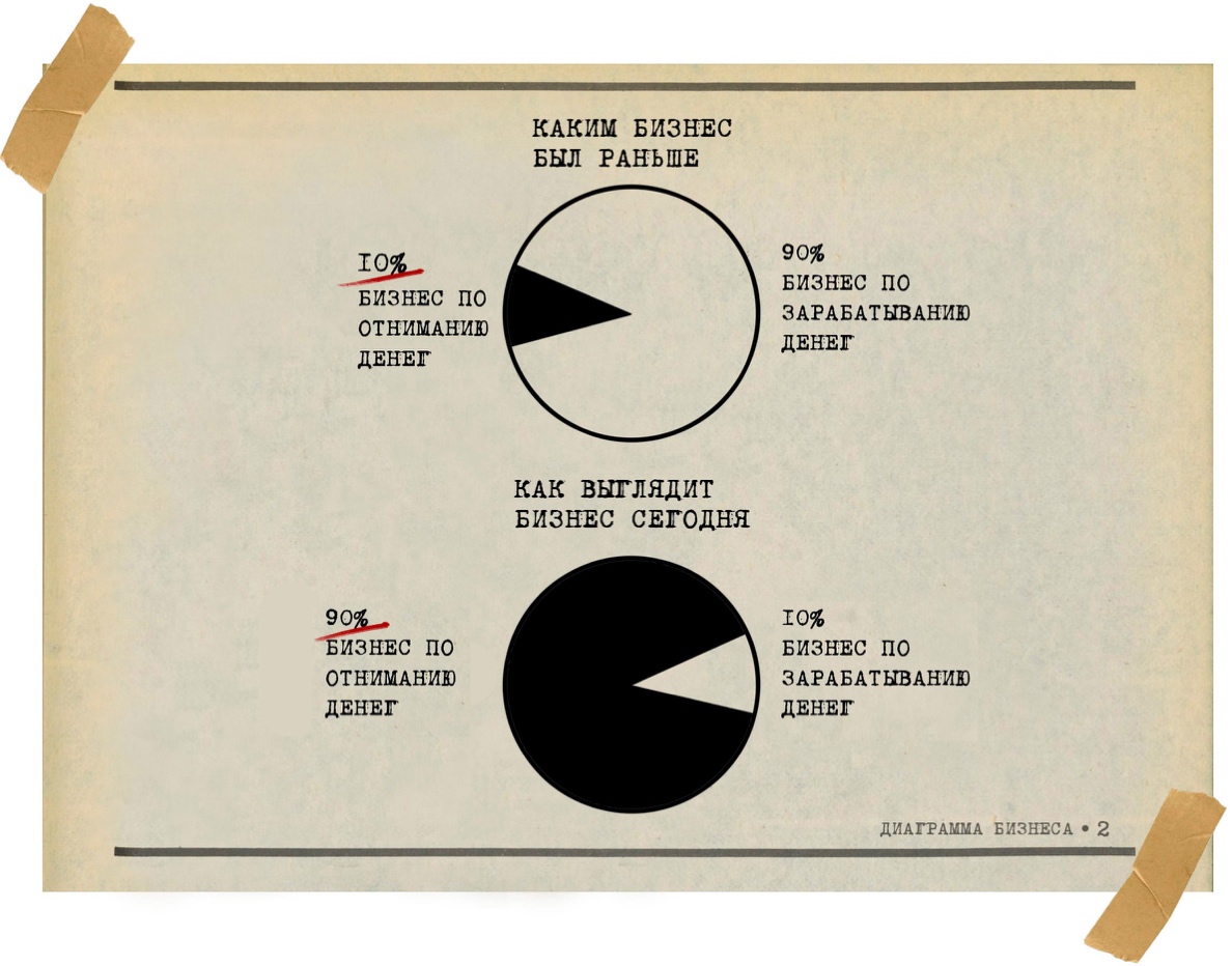 По факту, когда происходил этап становления и расцвета бизнеса в 20 веке, расстановка сил была такова: доля бизнеса по зарабатыванию денег составляла 90%, а доля бизнеса по отъёму денежных средств – 10%. Сегодня ситуация изменилась в точности до наоборот. Словно произошёл оверкиль. Нынче бизнес, создающий и осваивающий новые прибыльные сектора, неактуален. Сегодня деньги модно отбирать.