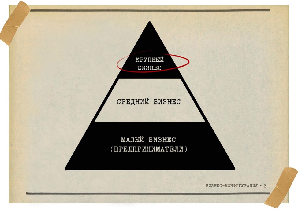 Как в 21 веке выглядит бизнес-конфигурация? Пропорции таковы: засилье малого бизнеса, которому активно подрезают крылья на лету; затем немногочисленная прослойка из среднего бизнеса; и редкие залетные хищники, играющие в бизнес по-крупному. Это своего рода пирамида.