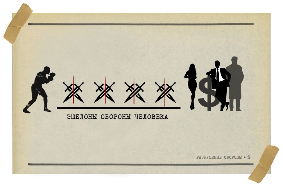 Конечно же, далеко не все предприниматели дураки. Так или иначе, обыкновенно человек, у которого есть деньги, и который умеет думать на год-другой вперёд, таки выстраивает некие эшелоны обороны. Однако нередки крайности вместо профессионального подхода: так, человеку кажется, что он самый умный или достаточно хитрый и изворотливый; у него есть друзья и связи, «где надо», а значит, он подстраховался. Но эти горизонтальные ограды высотой в полметра – не ровня вертикали, которая стояла за спиной Тайсона. Хитроумным наездникам куша почему-то кажется, что кто-то собирается идти напролом. И когда охотники за миллионами и миллиардами выходят на тропу войны, они к цели никогда не идут напрямую, нет; они «заборы» попросту обходят, изнутри подрывая и разрушая их один за другим. Так до тех пор, пока человек не становится голым и незащищенным. Так стартует маховик механизма «отбирания» денег.